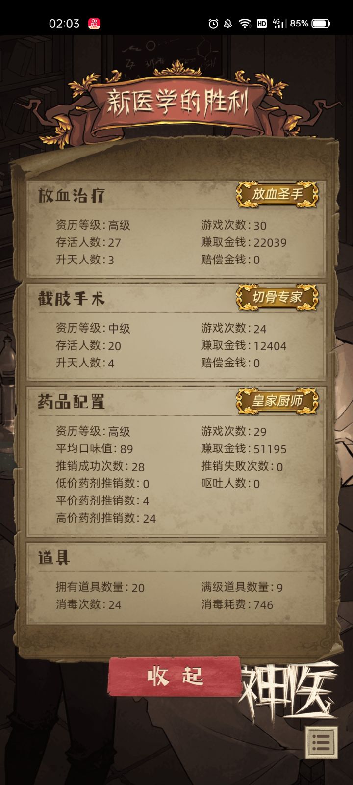 从社交软件上看到的安利特地来玩一下,游戏内容和形式上都和我想象的不太一样,是褒义的不一样,用角色扮演的方式来讲述一段历史,每一个词条我都认真看完了,现有的医学水平都是先人反复试错中取得的成果,玩完心里更感慨了😢。(截肢那里我真的每次都用最好的,明明画面很可爱但是我还是感觉很痛,特别是前期没有麻药的时候…想象自己快痛昏过去了哈哈哈)游戏是好玩的!以后也希望能玩到这种类型的游戏!