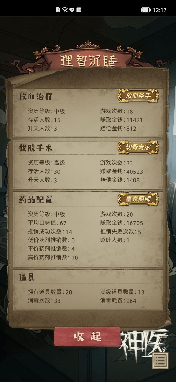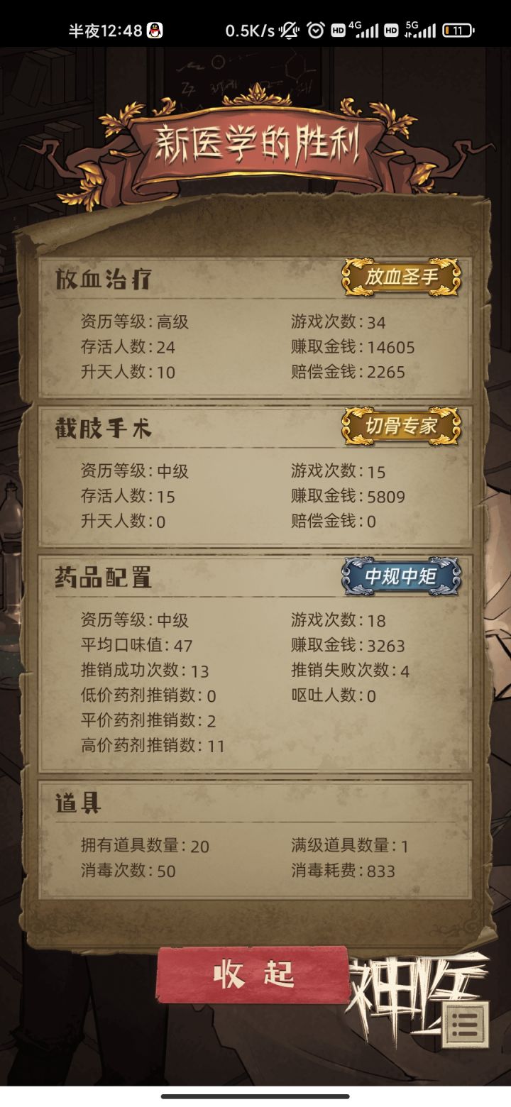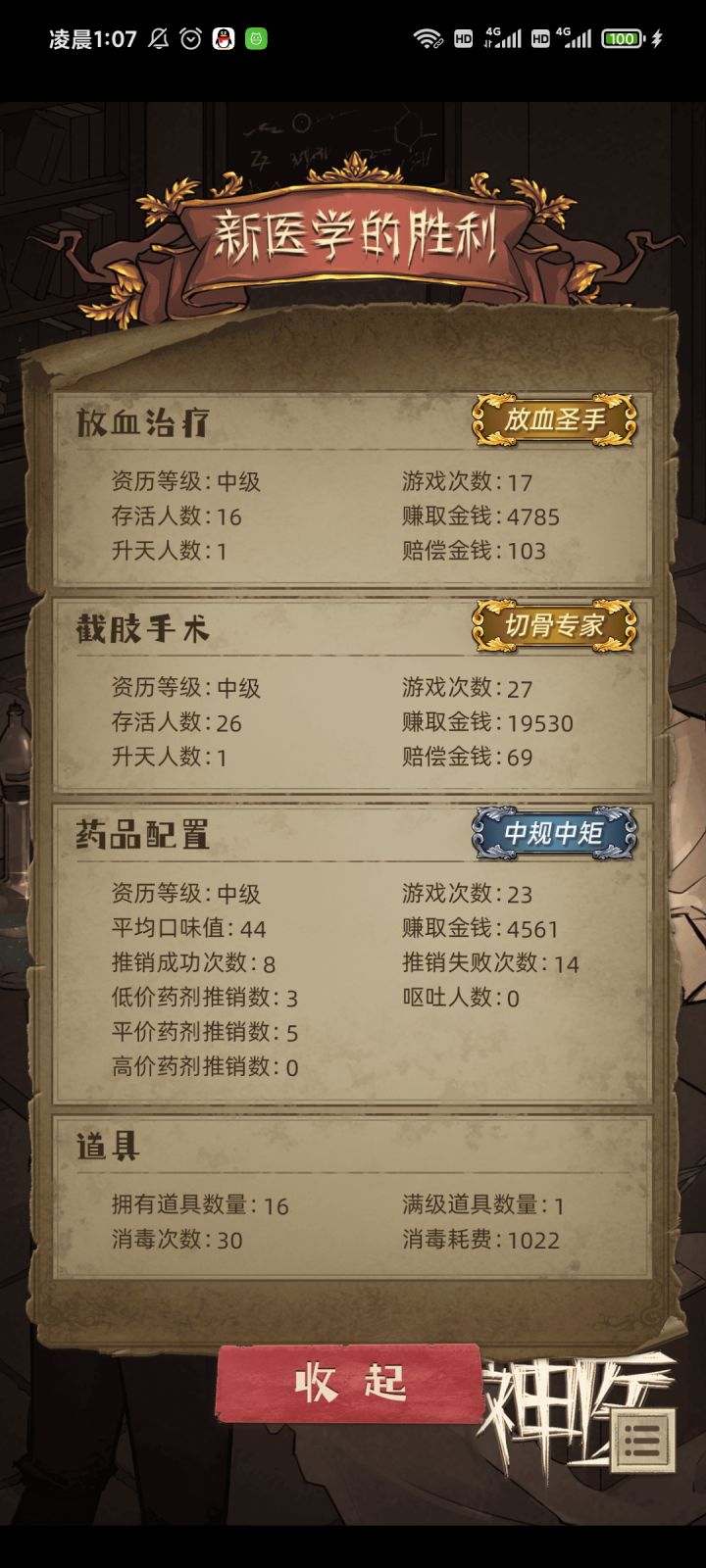 好耶!通关啦!游戏剧情很棒,就是感觉通关之后可以让玩家继续自主经营,不一定非要结束重新开始。当然只是个人的一个想法,希望可以被参考,比如可以让玩家创造药方,或者是锻造刀具,或者是研究一些新的医学具体领域等等。当然支线剧情也可以更丰富一些,继续加油(ง •̀_•́)ง,是个好游戏(✪▽✪)。