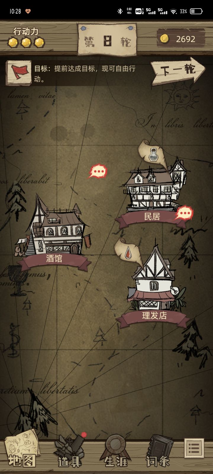 游戏还可以,我才刚玩到第四章,有一点小问题,章节剧情结束后,会出现一段时间的黑屏,大概十秒,但是右下角的设置是能点出来的,还有退出去点道具的时候,卡在的那个界面点不动了,手机是新手机没问题的
