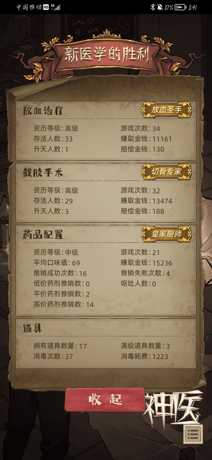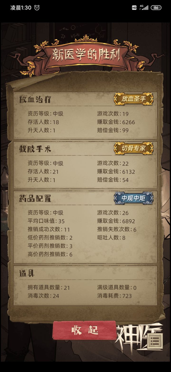 数据没太在意作为医学生,我觉得能了解一些医学历史,学一些知识同时还能打打游戏,是真的很不错的经历。只是我后边有点抵触放血疗法就一直锯人😂😂