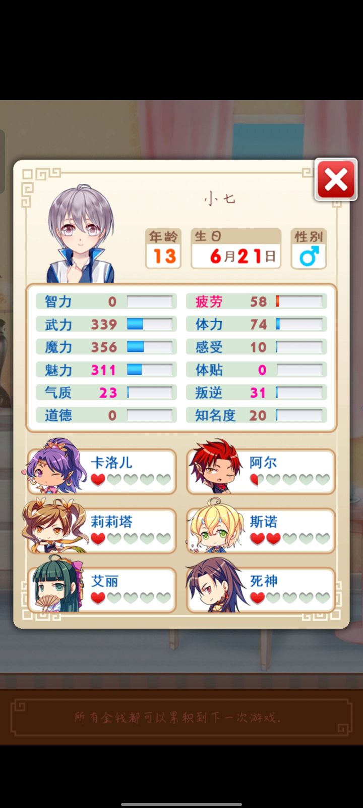 乞丐结局(女)属性无要求,只要金币<1即可(我寻思着,这不就是要变成0吗?)变成0应该蛮容易的吧?如果多的话,那就再打一下工,要注意体贴不要超200,结局会歪,还要注意其他的数据,就怕歪结局。楼主偷偷摸摸露个头:我并不知道平凡结婚和乞丐哪个优先