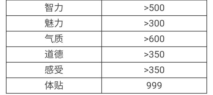 魅力 900+ 气质 900+ 道德 900+ 体力 无要求
