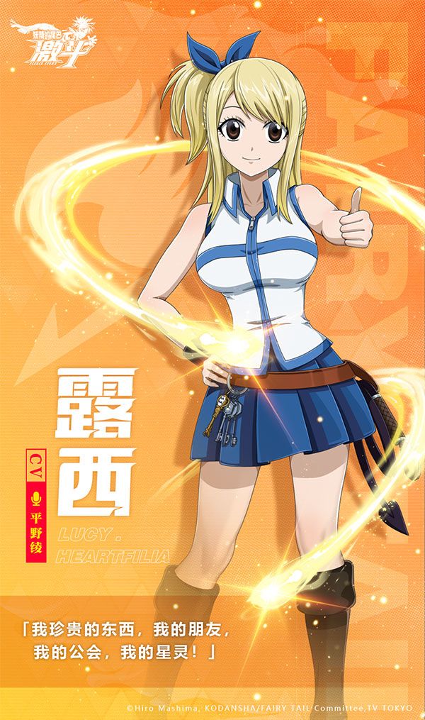 “我珍贵的东西,我的朋友,我的公会,我的星灵 ”CV:平野绫公会:妖精尾巴🌟星灵魔导士·全能物理型使用钥匙召唤星灵进行战斗的星灵魔导士。和纳兹、哈比的相遇后,加入了“妖精的尾巴”公会。在公会里,她的性格更像一个普通女孩子。但露西对朋友和星灵都很关心,当他们处于危险之中时,她也有坚强的意志,敢于向任何强大的对手挑战。🌟塔罗斯猛突:露西召唤塔罗斯,向敌人发起猛突,对前方直线范围内敌人造成