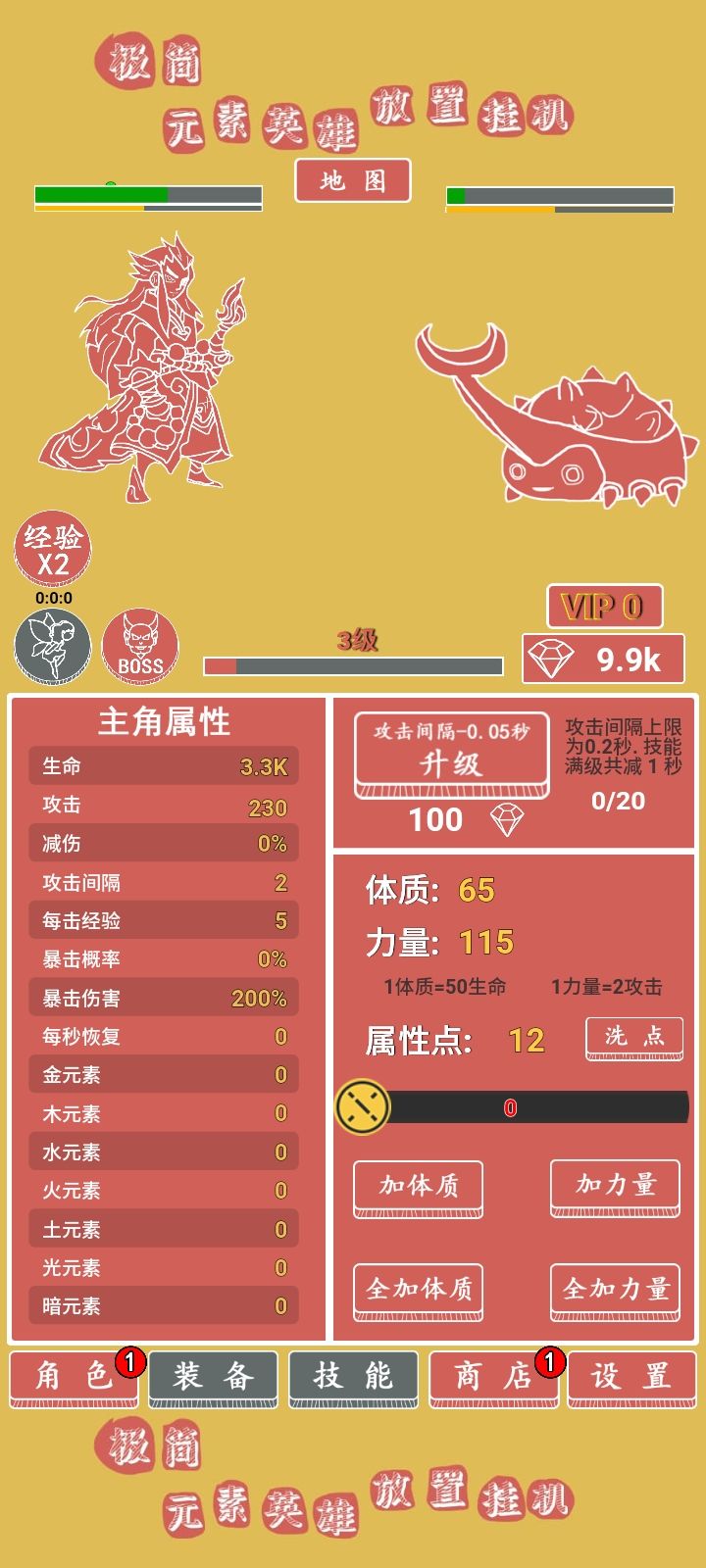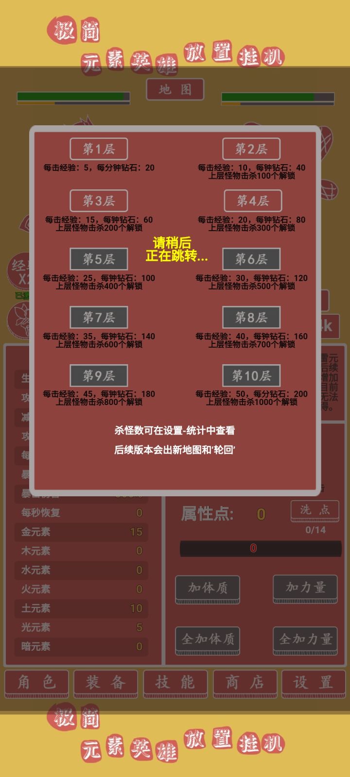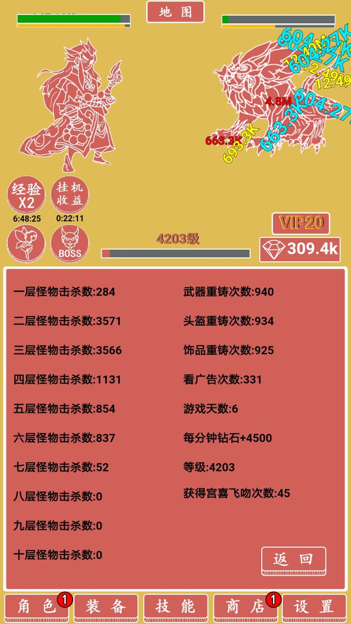 说个建议吧,就是那个装备等级和重置次数的显示问题。可以把三个装备的图标变成点击切换为:“头盔,等级数,重置数”。就是图标和数值可以切换那种。这样在同一个界面就能看见装备信息就不用总是去设置里面查找了,会比较方便。后面如果有无限轮回的话加点不同属性加成的宝物掉落可以自己搭配,还能卖掉换钻石。宝物种类和品质和地图进度挂钩。一个人也要加油啊💪