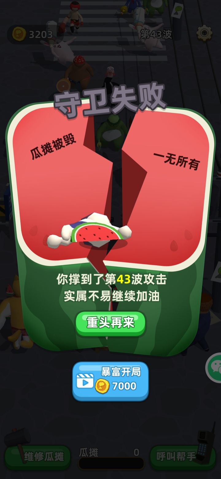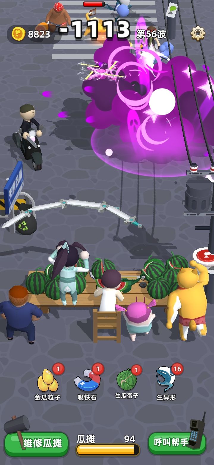 这游戏挺魔性的,玩了一个多小时了都,研究了下阵容,第一第二个买剑圣或飞机女孩,第三个第四个选撒币土豪和飞盘狗,,前期攒钱卖人三人口后升飞机女,伤害不高但攻速快啊,然后升撒币土豪,附加攻击对西瓜摊主和飞机女孩都有加成,为啥选剑圣和狗不选水枪熊孩子和扔瓶子大叔是因为我有强迫症,剑圣纵向攻击狗子横向攻击而且AOE距离选伤害还高,对移速快的小怪都是秒杀,这个阵容摊主一般吃瓜很少战斗可以看到攻速很高伤害受
