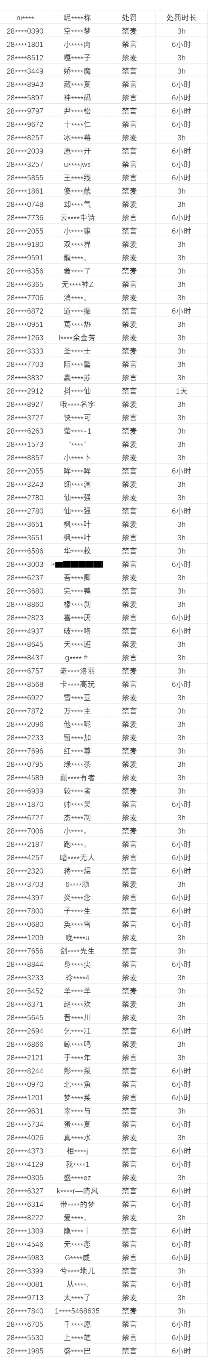 随着SS3赛季开启,为了优化对局环境,为萤火虫们带来更好的新战场体验,除打击外挂之外,我们实施了更为严格的禁言和禁麦处罚措施,通过净化语音频道,让游戏环境变得更好! 目前已对41569位萤火虫分别进行禁言、禁麦3小时、6小时、一天处罚,并在此公示,希望萤火虫们以此为戒,文明对局,共同创造良好的对局环境! 部分禁言、禁麦公示 当然,我们打击外挂之心仍旧坚定,在SS3赛季同样加强了外挂