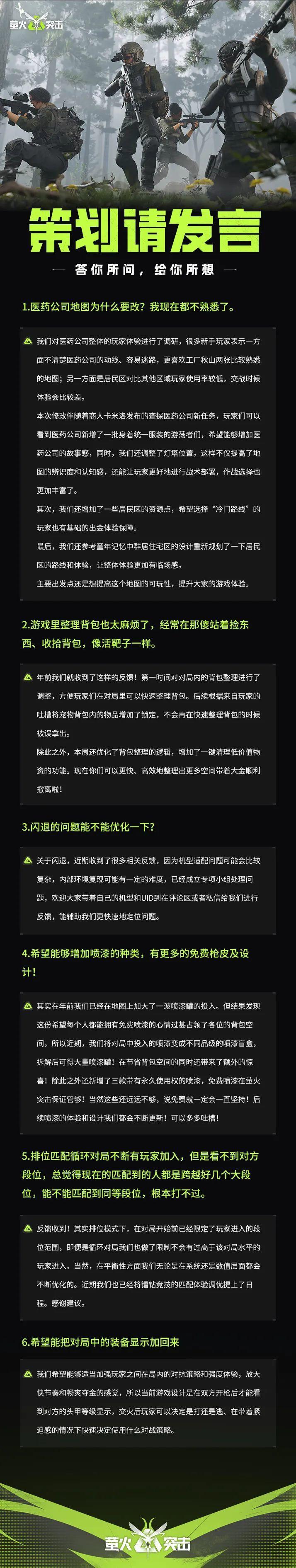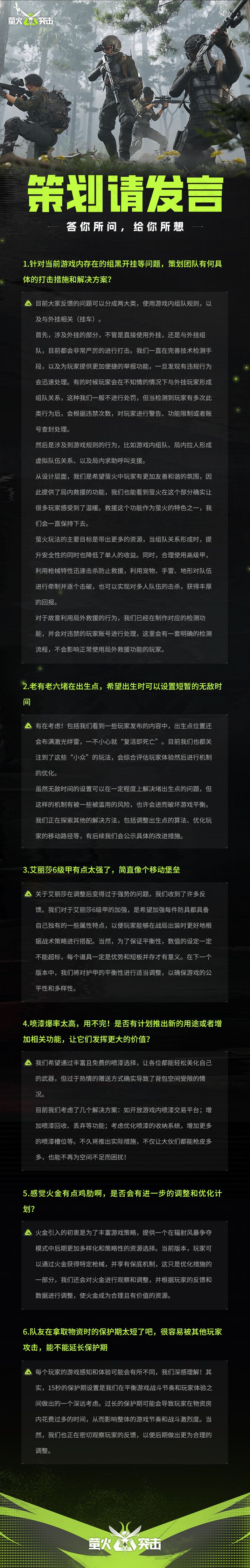 三月春风轻抚,在这个充满生机的时节,萤火带着永远蓬勃的热忱和诚意,为大家带来新一期《策划请发言》,在过去的日子里我们收到了大家宝贵的反馈和建议组黑问题能不能管控?有老六堵出生点,复活给几秒无敌是否可行?火金太鸡肋求改进!......针对这些热门问题,我们为大家带来了详尽的解答! 三月,是新的开始,也是新的起点。让我们携手共进,共同创造更加精彩的萤火!如果你在游戏中还