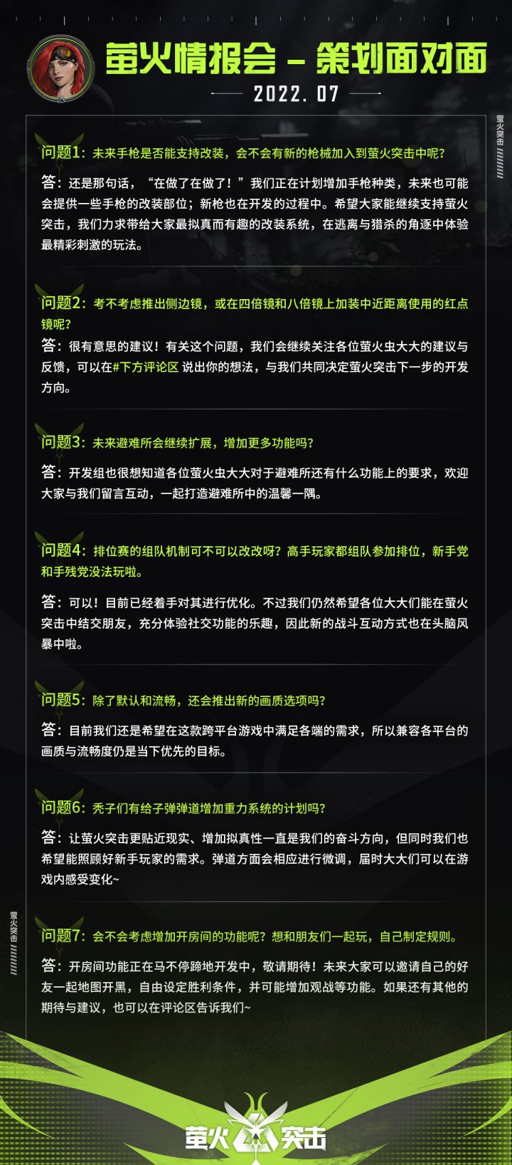 嘿,各位萤火队员:萤火情报会带来了最新消息,本期策划面对面将为大家解答“枪械改装,侧边镜,组队机制”等问题,更多问题回复快戳开长图了解详情吧!对啦,萤火情报会也会不断给各位萤火队员带来最新消息,敬请期待啦~