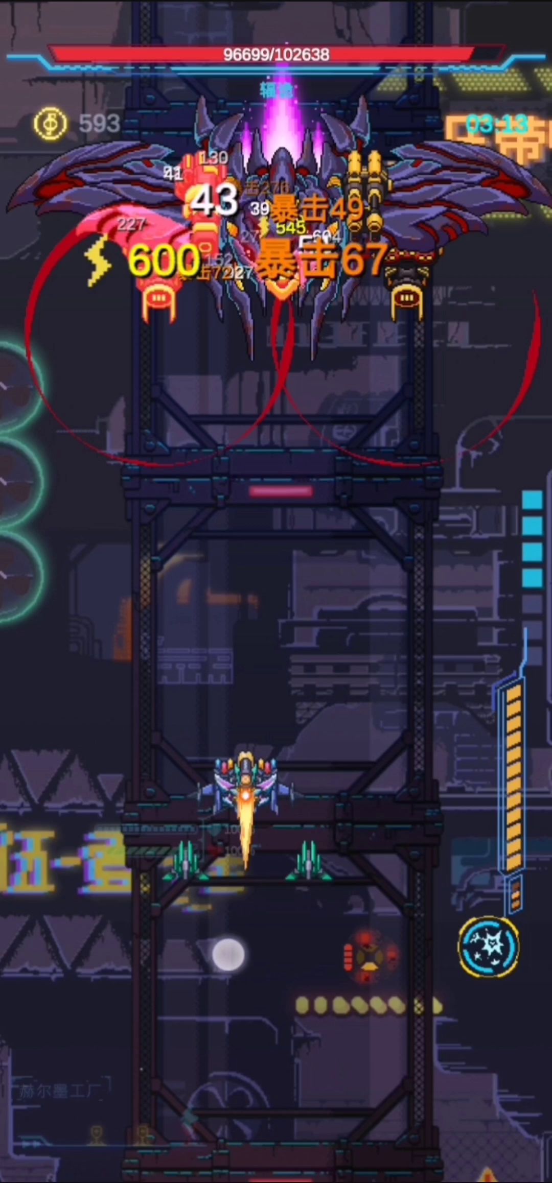 和变异一样,也有五个部位,开局副炮固定发射弹幕,快结束时主炮必定激光,可以参考视频位置站位,激光结束肩炮副炮开始攻击,站在BOSS主炮位置即可(参考视频位置),作为开局第一个BOSS,血量相对较少,可以先集中火力打掉主炮和一个肩炮,防止弹幕过多,副炮看情况决定优先级(有跟踪副炮可以最后打),需要特别注意常态跟变异一样会跟随飞机位置调整射击方向(所以为啥蝙蝠会乱动,是因为特性吗🙁)