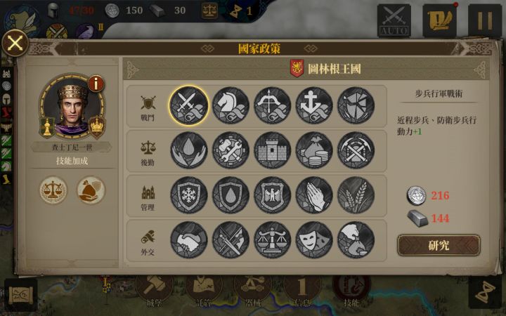 图灵根王国位于法兰克的西北,目标有三个:占领科隆,灭掉伦巴第,活到15回合。开局先把执政官还成察士丁尼。开局下面三个部队上将,攻击斯图加特,上面国王补兵,招募第一个将领。国王拉出来,准备偷科隆。升级艾尔福特民居并完成两个任务。回合2下面继续打斯图加特,上面国王继续往科隆走,中间将领也往法兰克福走。回合3下面上面继续,中间打一下法兰克福。斯图加特拿下,攻击奥格斯堡。继续打科隆和法