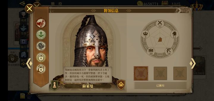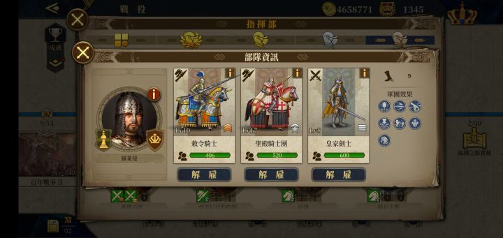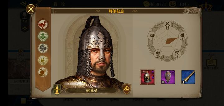 苏定方专属陌刀营,李世民专属连弩营,李靖专属重装玄甲骑,还有横刀营和近卫玄甲骑没有配套将领,按照之前高级兵种都有绑定高品质将领的惯例,应该还要再出两个唐朝名将。因为背景是中世纪、横跨亚欧非的欧陆战争,所以不仅要是时代顶尖,国际知名度也很重要,暂时列出以下几位,觉得比较有可能。李勣,王忠嗣,郭子仪、李光弼(其中之一),高仙芝,薛仁贵番将(契苾何力,仆固怀恩,黑齿常之等)暂不考虑