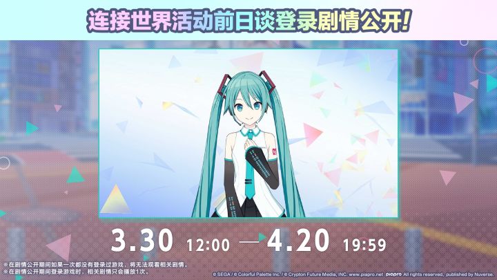 感谢各位居民对《初音未来:缤纷舞台》的支持。我们将于3/30 12:00起公开「连接世界活动前日谈登录剧情」。「连接世界活动前日谈登录剧情」会在3/30 ~ 4/20间开放。■公开期间・3/30 12:00 ~ 4/20 19:59■注意事项・剧情会在居民进入游戏主界面时自动播放。若没有播放,请回到标题界面并再次登录。・若在剧情公开期间内一次都没有登录,将无法观赏剧情。今后也请多多