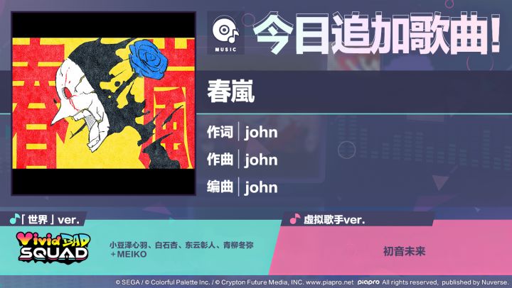 尊敬的各位「世界」居民:感谢各位居民对《初音未来:缤纷舞台》的支持。 5/16 15:00起,将追加歌曲《春嵐(春岚)》!可以在现实世界的「音乐商店」兑换追加的歌曲。■歌曲介绍《春嵐(春岚)》作词:john作曲:john编曲:john歌手虚拟歌手ver.:初音未来(Original CV by 藤田咲)「世界」ver.:MEIKO(Original CV by 拜乡芽衣子)