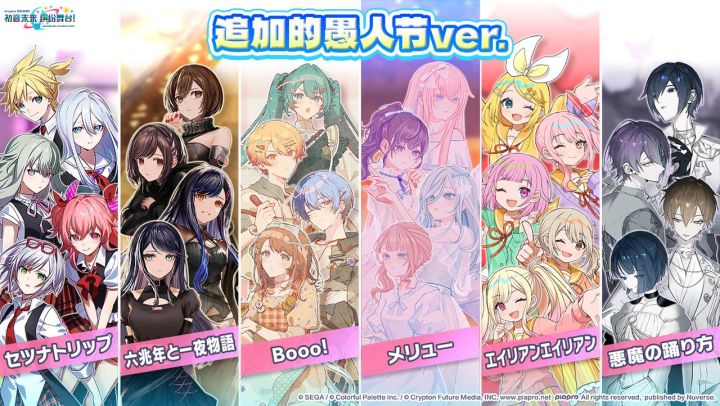 尊敬的各位「世界」居民:4/1 0:00起,已新增愚人节ver.到以下歌曲。《青く駆けろ!(奔向蓝天!)》愚人节 ver.:初音未来(Original CV by 藤田咲)、星乃一歌(CV. 野口瑠璃子)、天马咲希(CV. 礒部花凛)、桃井爱莉(CV. 降幡爱)、东云绘名(CV. 铃木实里)《ハッピーシンセサイザ(快乐合成器)》愚人节 ver.:日野森志步(CV. 中岛由贵)、日野森雫(