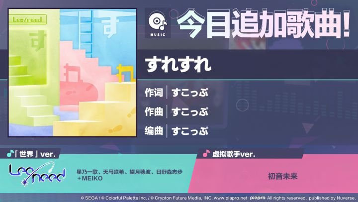 尊敬的各位「世界」居民:感谢各位居民对《初音未来:缤纷舞台》的支持。 5/10 22:05起,将追加歌曲《すれすれ》!可以到「礼物」领取追加歌曲。■歌曲介绍《すれすれ》作词:すこっぷ作曲:すこっぷ编曲:すこっぷ歌手虚拟歌手ver.:初音未来(Original CV by 藤田咲)「世界」ver.:MEIKO(Original CV by 拜乡芽衣子)、星乃一歌(CV. 野口