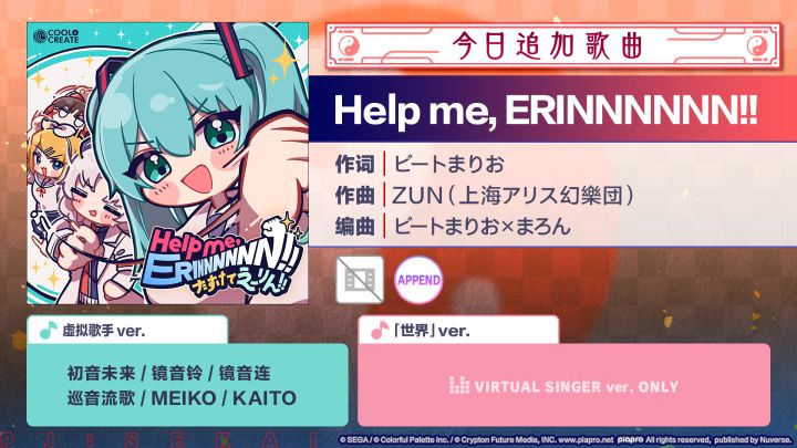 尊敬的各位「世界」居民:感谢各位居民对《初音未来:缤纷舞台》的支持。 6/2 15:00起追加《东方Project》联动歌曲《Help me, ERINNNNNN!!》!可以在现实世界的「音乐商店」兑换追加的歌曲。■歌曲介绍《Help me, ERINNNNNN!!》作词:ビートまりお作曲:ZUN(上海アリス幻樂団)编曲:ビートまりお×まろん歌手虚拟歌手ver.:初音未来(O