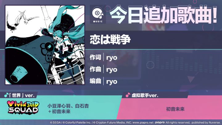 尊敬的各位「世界」居民:感谢各位居民对《初音未来:缤纷舞台》的支持。5/20 13:14起,将追加歌曲《恋は戦争》!可以在现实世界的「音乐商店」兑换追加的歌曲。■歌曲介绍《恋は戦争》作词:ryo作曲:ryo编曲:ryo歌手虚拟歌手ver.:初音未来(Original CV by 藤田咲)「世界」ver.:初音未来(Original CV by 藤田咲)、小豆泽心羽(CV. 秋