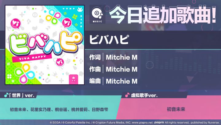 尊敬的各位「世界」居民:感谢各位居民对《初音未来:缤纷舞台》的支持。 4/6 15:00起,将追加歌曲《ビバハピ(快乐万岁)》!可以在现实世界的「音乐商店」兑换追加的歌曲。 ■歌曲介绍《ビバハピ(快乐万岁)》作词:Mitchie M作曲:Mitchie M编曲:Mitchie M歌手虚拟歌手ver.:初音未来(Original CV by 藤田咲)「世界」ver.:初音未