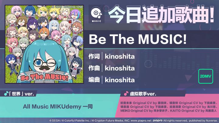 尊敬的各位「世界」居民:感谢各位居民对《初音未来:缤纷舞台》的支持。 今日将追加歌曲《Be The MUSIC!》及《My Stage With You》!可以到「礼物」领取追加歌曲《Be The MUSIC!》;可以在现实世界的「音乐商店」兑换追加歌曲《My Stage With You》。■歌曲介绍《Be The MUSIC!》作词:キノシタ作曲:キノシタ编曲:キノシタ歌