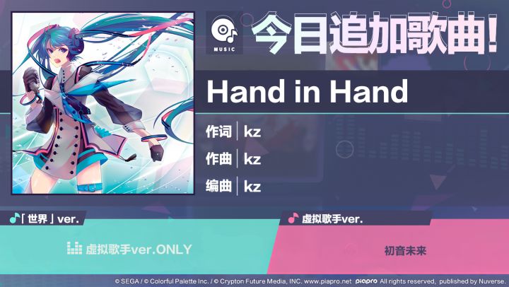 尊敬的各位「世界」居民:感谢各位居民对《初音未来:缤纷舞台》的支持。 4/7 15:00起,将追加歌曲《Hand in Hand》!可以在现实世界的「音乐商店」兑换追加的歌曲。■歌曲介绍《Hand in Hand》作词:kz作曲:kz编曲:kz歌手虚拟歌手ver.:初音未来(Original CV by 藤田咲) ※以上歌曲名称,作词作曲家名称均为暂定名称。 今后也