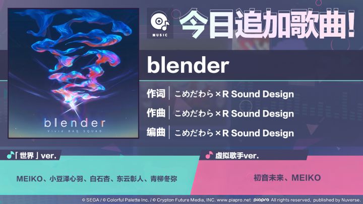 尊敬的各位「世界」居民:感谢各位居民对《初音未来:缤纷舞台》的支持。 4/9 22:05起,将追加歌曲《blender》!可以到「礼物」领取追加的歌曲。■歌曲介绍《blender》作词:こめだわら×R Sound Design作曲:こめだわら×R Sound Design编曲:こめだわら×R Sound Design歌手虚拟歌手ver.:初音未来(Original CV b