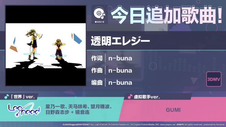 尊敬的各位「世界」居民:感谢各位居民对《初音未来:缤纷舞台》的支持。12/31 15:00起,将追加歌曲《透明エレジー(透明哀歌)》!可以在现实世界的「音乐商店」兑换追加的歌曲。■歌曲介绍《透明エレジー(透明哀歌)》作词:n-buna作曲:n-buna编曲:n-buna歌手虚拟歌手ver.:GUMI「世界」ver.:镜音连(Original CV by 下田麻美)、星乃一歌(