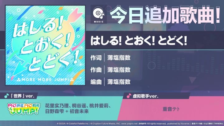 尊敬的各位「世界」居民:感谢各位居民对《初音未来:缤纷舞台》的支持。12/19 22:05起,将追加歌曲《はしる! とおく! とどく!》!可以到「礼物」领取追加歌曲。■歌曲介绍《はしる! とおく! とどく!》作词:薄塩指数作曲:薄塩指数编曲:薄塩指数歌手虚拟歌手ver.:重音テト「世界」ver.:初音未来(Original CV by 藤田咲)、花里实乃理(CV. 小仓唯)、