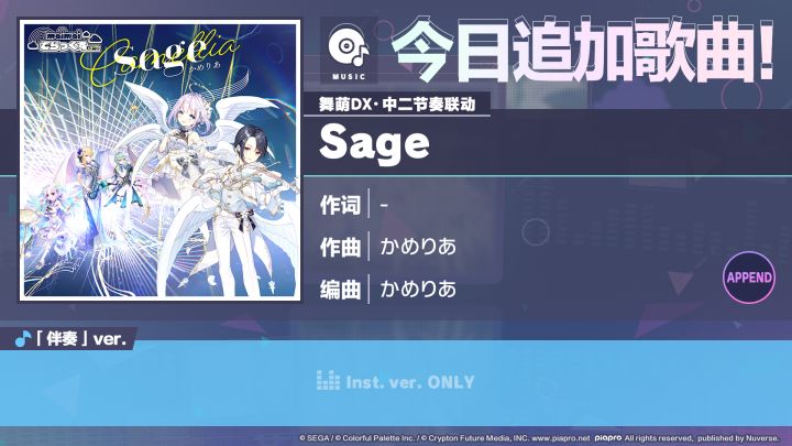 尊敬的各位「世界」居民:感谢各位居民对《初音未来:缤纷舞台》的支持。 12/8 12:00起,追加《初音未来:缤纷舞台》×《舞萌DX》《中二节奏》联动歌曲《Sage》!可以在现实世界的「音乐商店」兑换追加的歌曲。■歌曲介绍《Sage》作词:-作曲:かめりあ编曲:かめりあ歌手本首歌曲仅有伴奏版。 今后也请多多支持《初音未来:缤纷舞台》!立即前往「世界」>>>加入官方社群