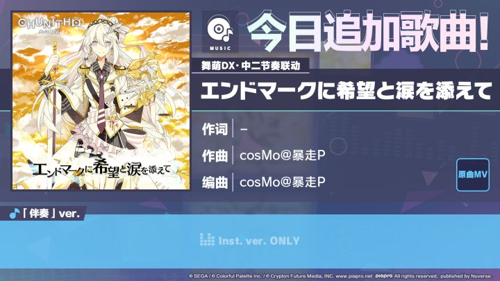 尊敬的各位「世界」居民:感谢各位居民对《初音未来:缤纷舞台》的支持。 12/4 12:00起,追加《初音未来:缤纷舞台》×《舞萌DX》《中二节奏》联动歌曲《エンドマークに希望と涙を添えて》!可以在现实世界的「音乐商店」兑换追加的歌曲。■歌曲介绍《エンドマークに希望と涙を添えて》作词:-作曲:cosMo@暴走P编曲:cosMo@暴走P歌手本首歌曲仅有伴奏版。 今后也请多多支