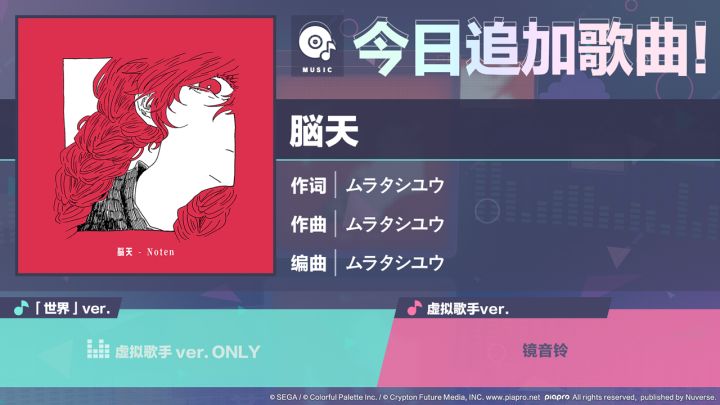 尊敬的各位「世界」居民:感谢各位居民对《初音未来:缤纷舞台》的支持。11/24 15:00起,追加歌曲《脳天》!可以在现实世界的「音乐商店」兑换追加的歌曲。■歌曲介绍《脳天》作词:ムラタシユウ作曲:ムラタシユウ编曲:ムラタシユウ歌手虚拟歌手ver.:镜音铃(Original CV by 下田麻美)今后也请多多支持《初音未来:缤纷舞台》!立即前往「世界」>>>加入官方社群>
