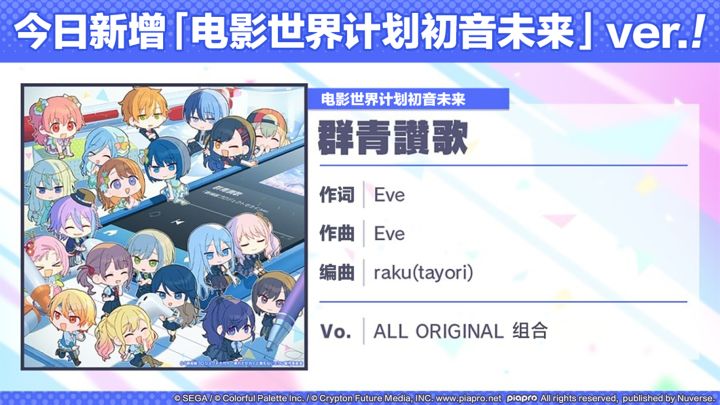 尊敬的各位「世界」居民:感谢各位居民对《初音未来:缤纷舞台》的支持。11/16 15:00起将追加歌曲《群青讃歌(群青赞歌)》的「电影世界计划初音未来」ver. !■ 追加内容「电影世界计划初音未来」ver.《群青讃歌(群青赞歌)》ALL ORIGINAL 组合※如果未持有该歌曲,将无法游玩「电影世界计划初音未来」ver.。今后也请多多支持《初音未来:缤纷舞台》!立即前往「世界」
