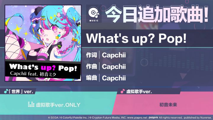 尊敬的各位「世界」居民:感谢各位居民对《初音未来:缤纷舞台》的支持。 5/26 15:00起,将追加歌曲《What's up? Pop!》!可以在现实世界的「音乐商店」兑换追加的歌曲。■歌曲介绍《What's up? Pop!》作词:Capchii作曲:Capchii编曲:Capchii歌手虚拟歌手ver.:初音未来(Original CV by 藤田咲) ※以上歌曲名