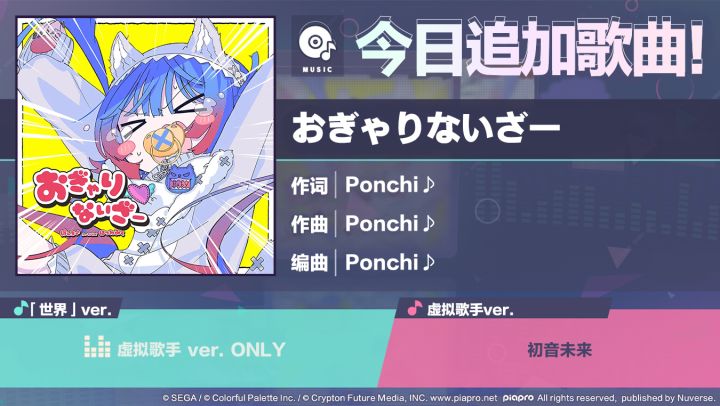尊敬的各位「世界」居民:感谢各位居民对《初音未来:缤纷舞台》的支持。 7/16 15:00起,将追加歌曲《おぎゃりないざー》!可以在现实世界的「音乐商店」兑换追加的歌曲。■歌曲介绍《おぎゃりないざー》作词:Ponchi♪作曲:Ponchi♪编曲:Ponchi♪歌手虚拟歌手ver.:初音未来(Original CV by 藤田咲) 今后也请多多支持《初音未来:缤纷舞台》!立