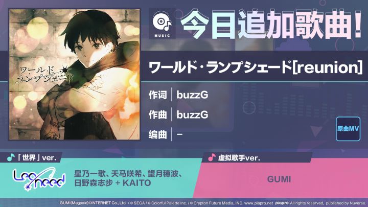 尊敬的各位「世界」居民:感谢各位居民对《初音未来:缤纷舞台》的支持。 9/29 15:00起,追加歌曲《ワールド・ランプシェード [reunion]》!可以在现实世界的「音乐商店」兑换追加的歌曲。■歌曲介绍《ワールド・ランプシェード [reunion]》作词:buzzG作曲:buzzG编曲:-歌手虚拟歌手ver.:GUMI「世界」ver.:KAITO(Original CV