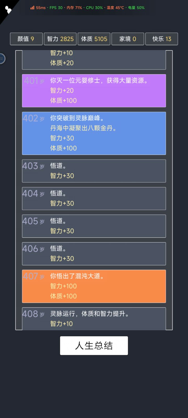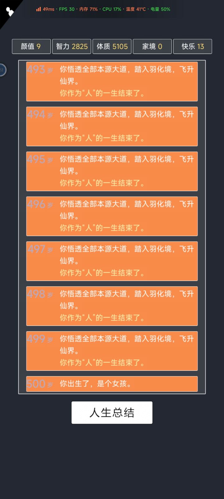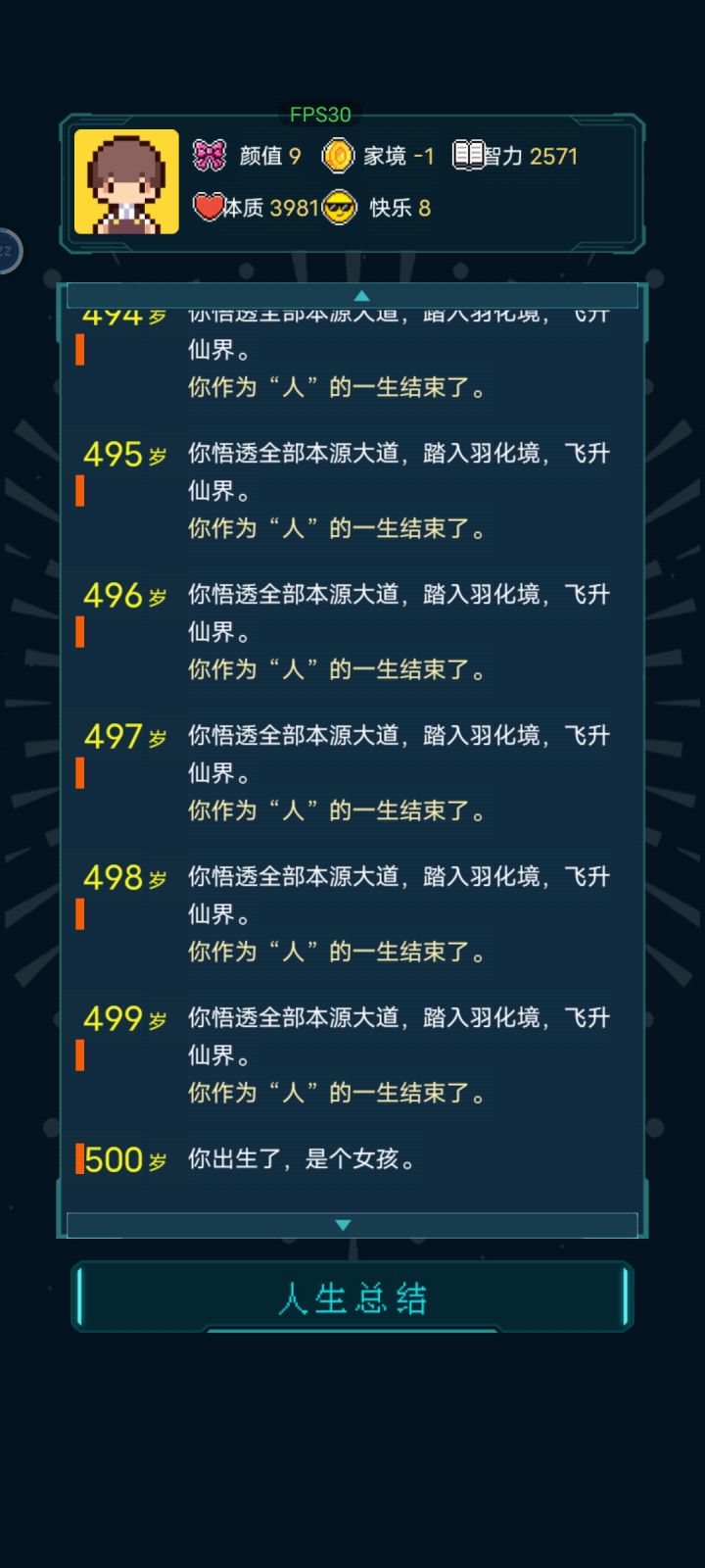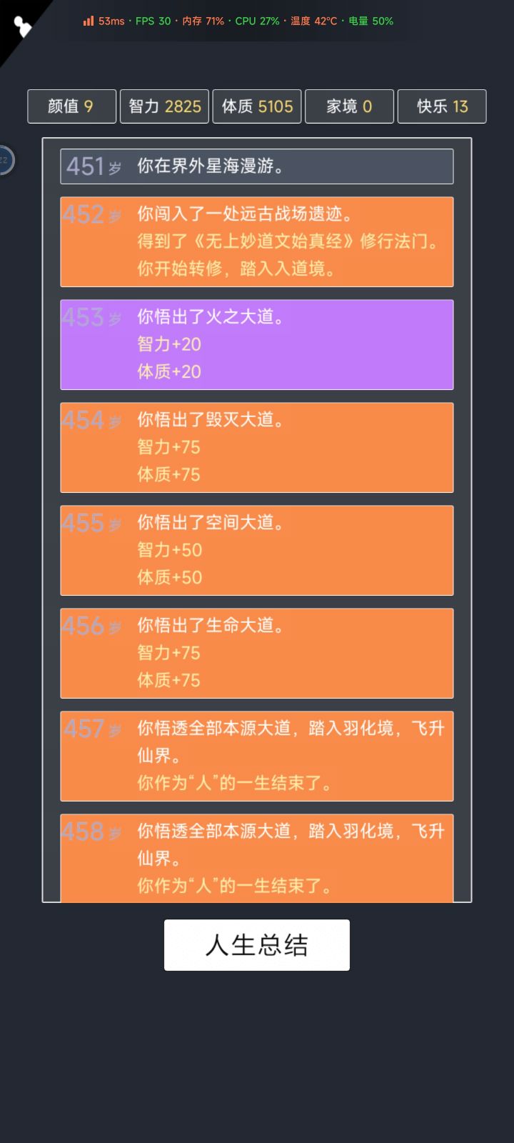 我加点5.10.3.2带轮回之外,M籍华人。智力11遇见乞丐买不灭元神,意外身亡开始修炼夺舍,最后因为没有千世轮回没有飞升,太可惜了。