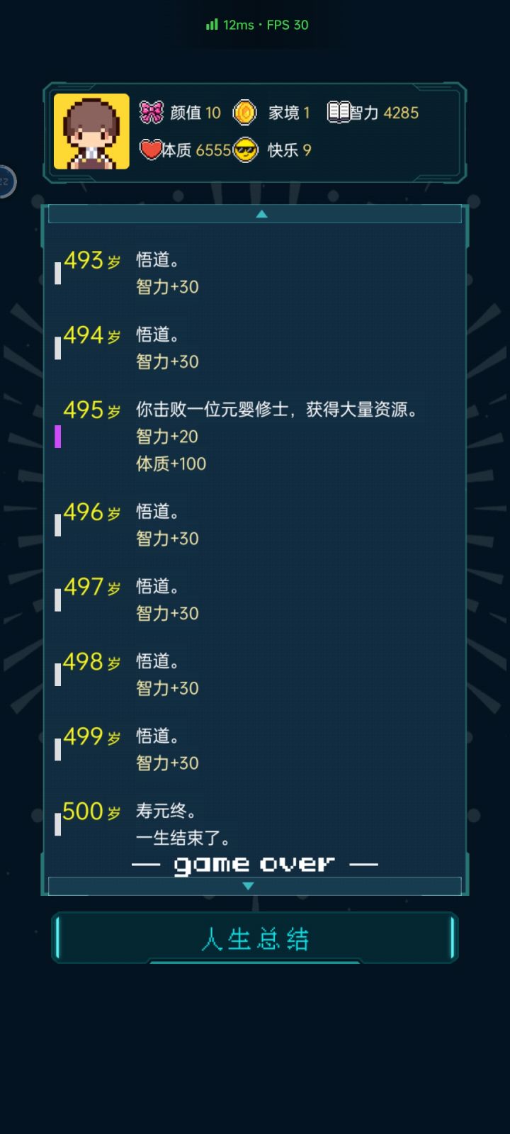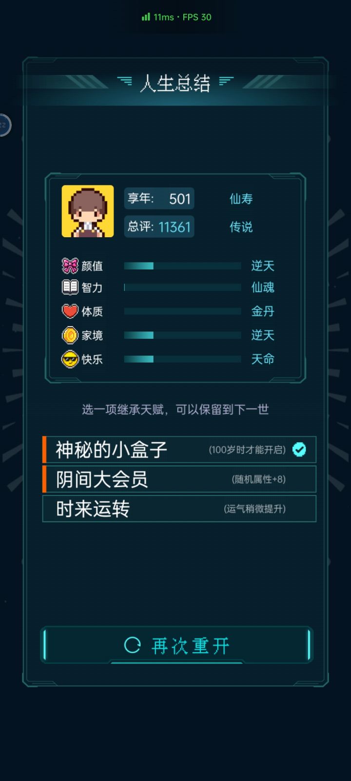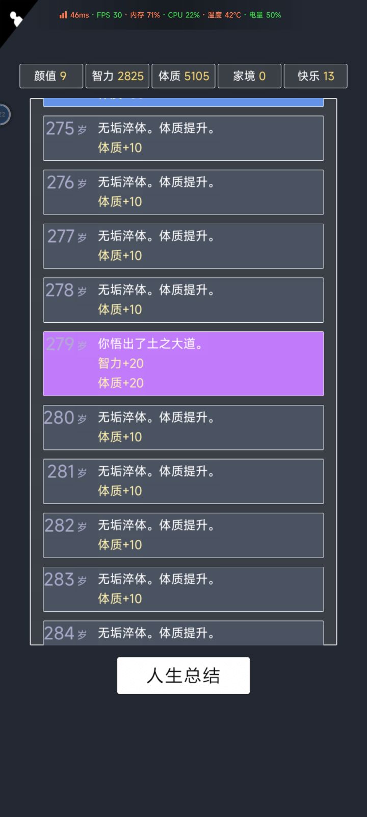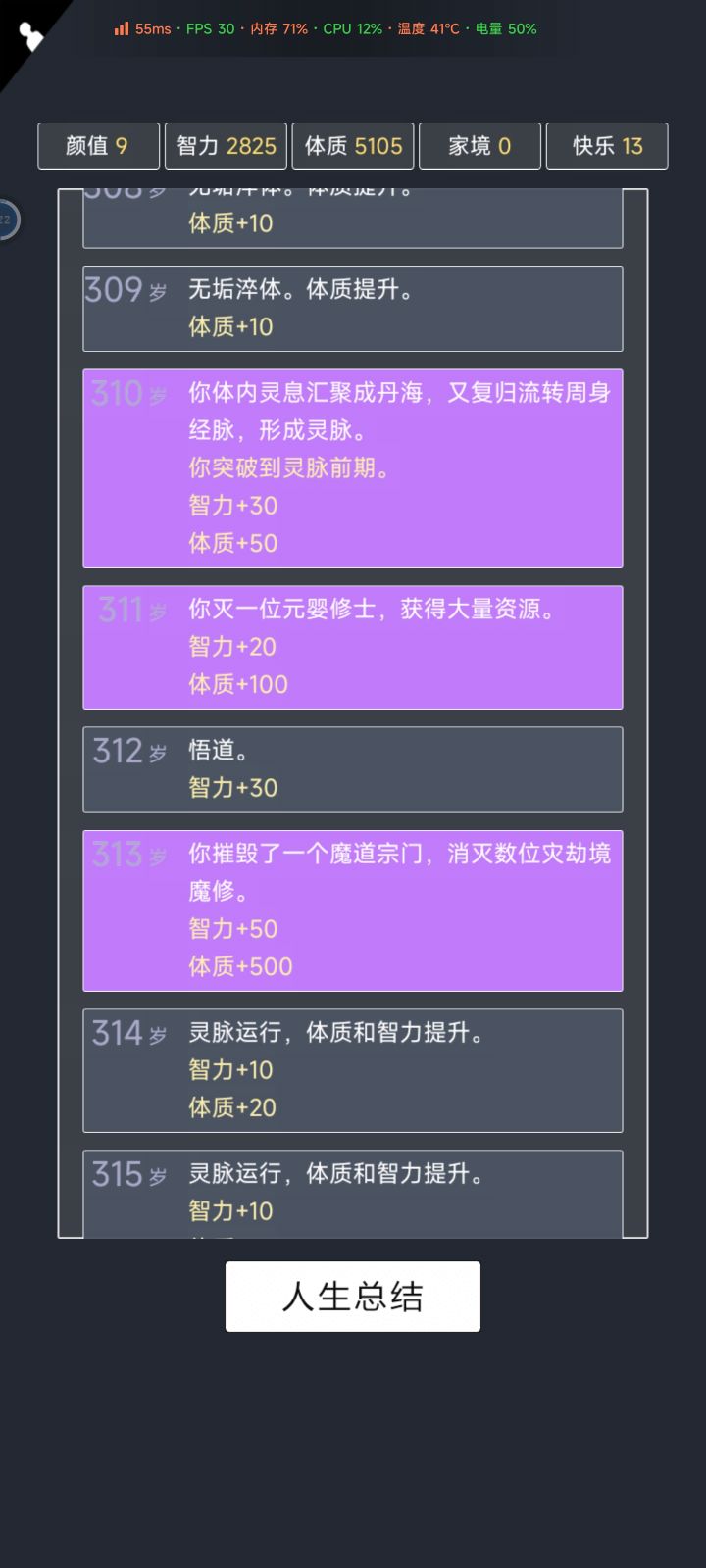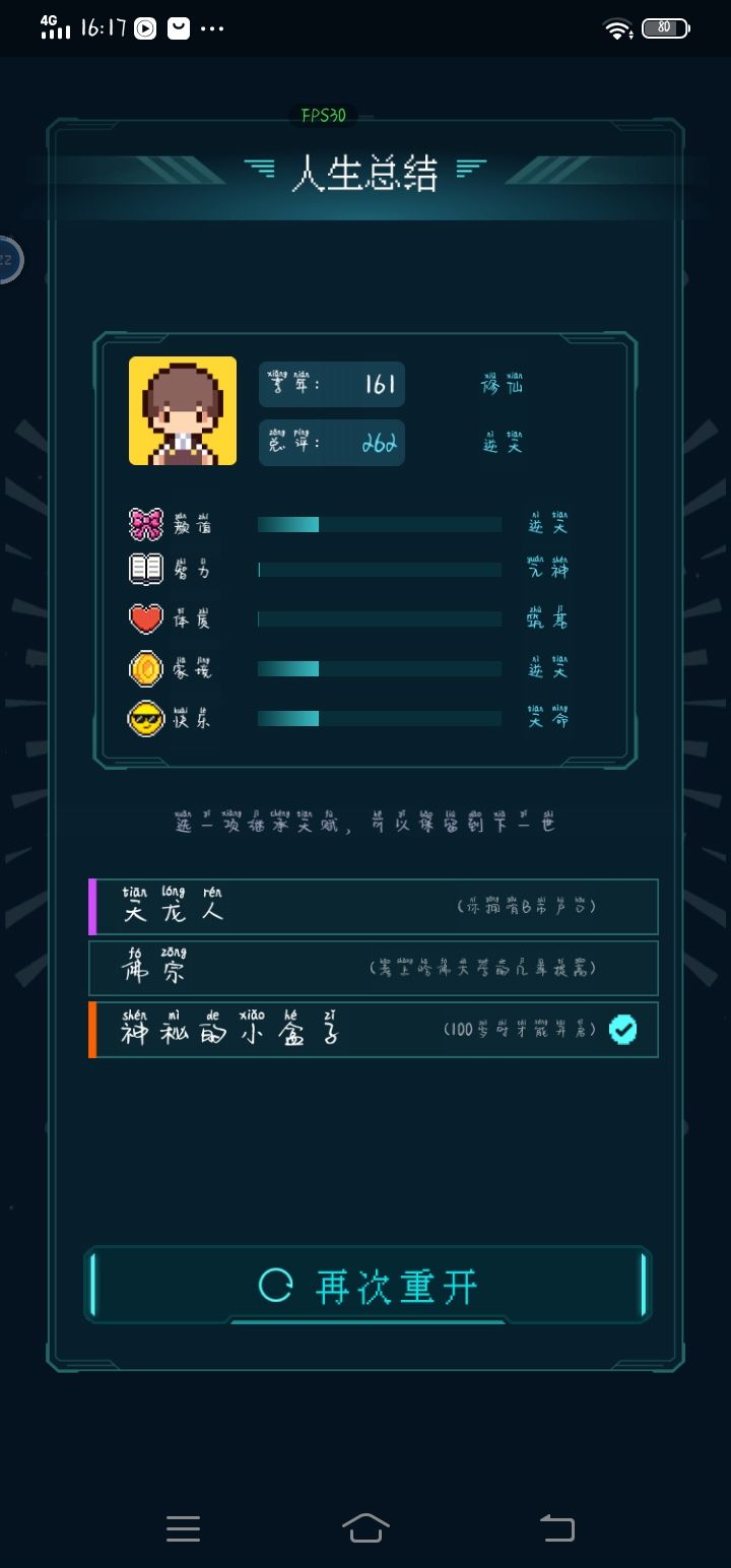 我加点5.10.3.2带轮回之外,M籍华人。智力11遇见乞丐买不灭元神,意外身亡开始修炼夺舍,最后因为没有千世轮回没有飞升,太可惜了。