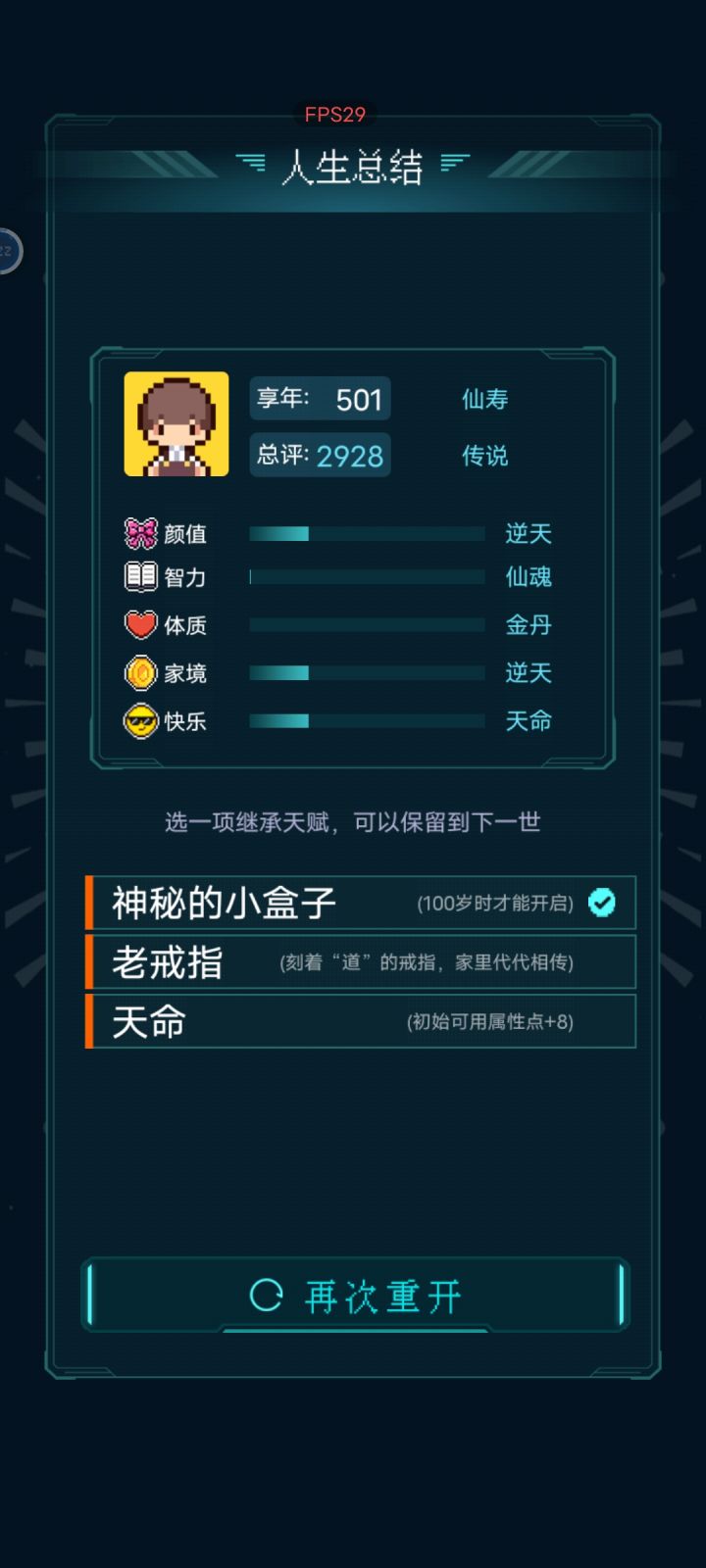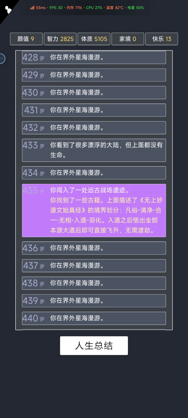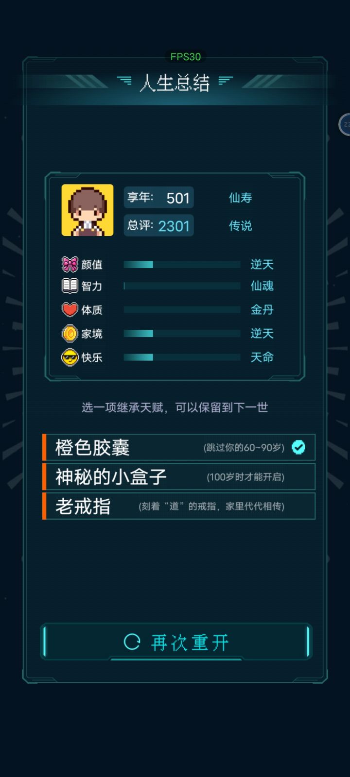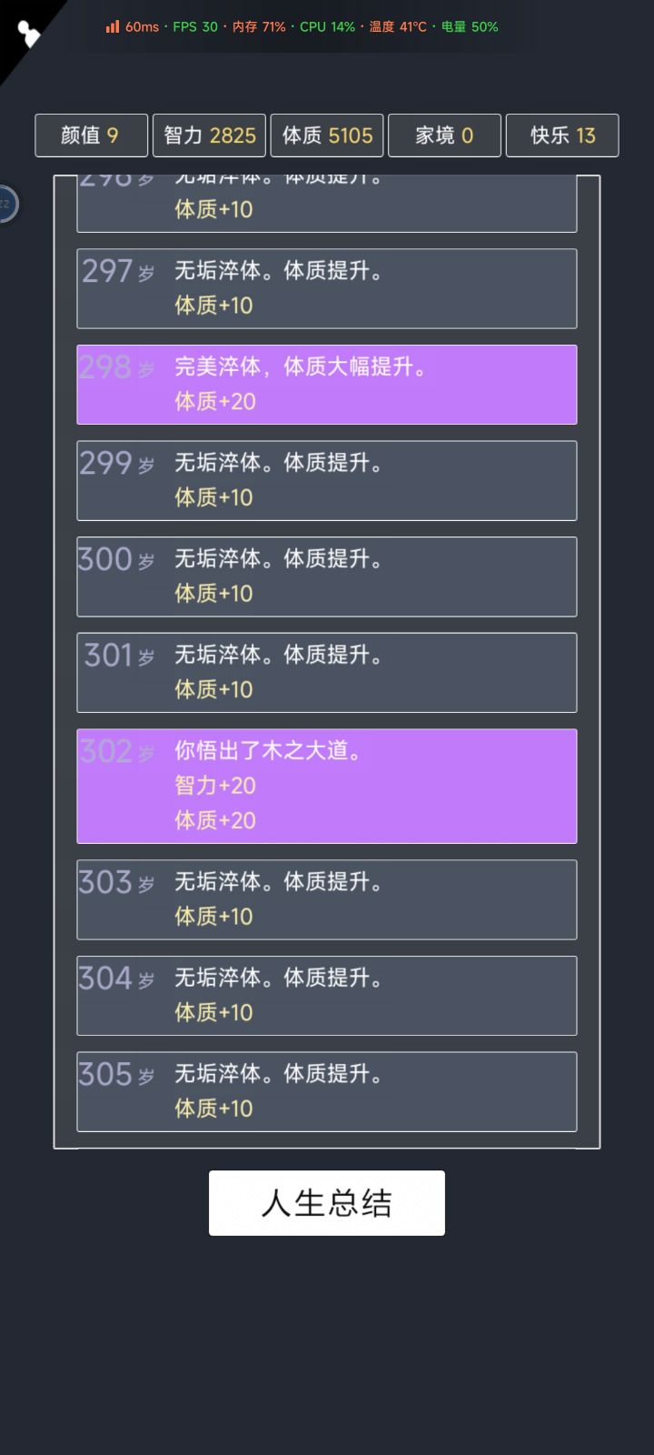 我加点5.10.3.2带轮回之外,M籍华人。智力11遇见乞丐买不灭元神,意外身亡开始修炼夺舍,最后因为没有千世轮回没有飞升,太可惜了。