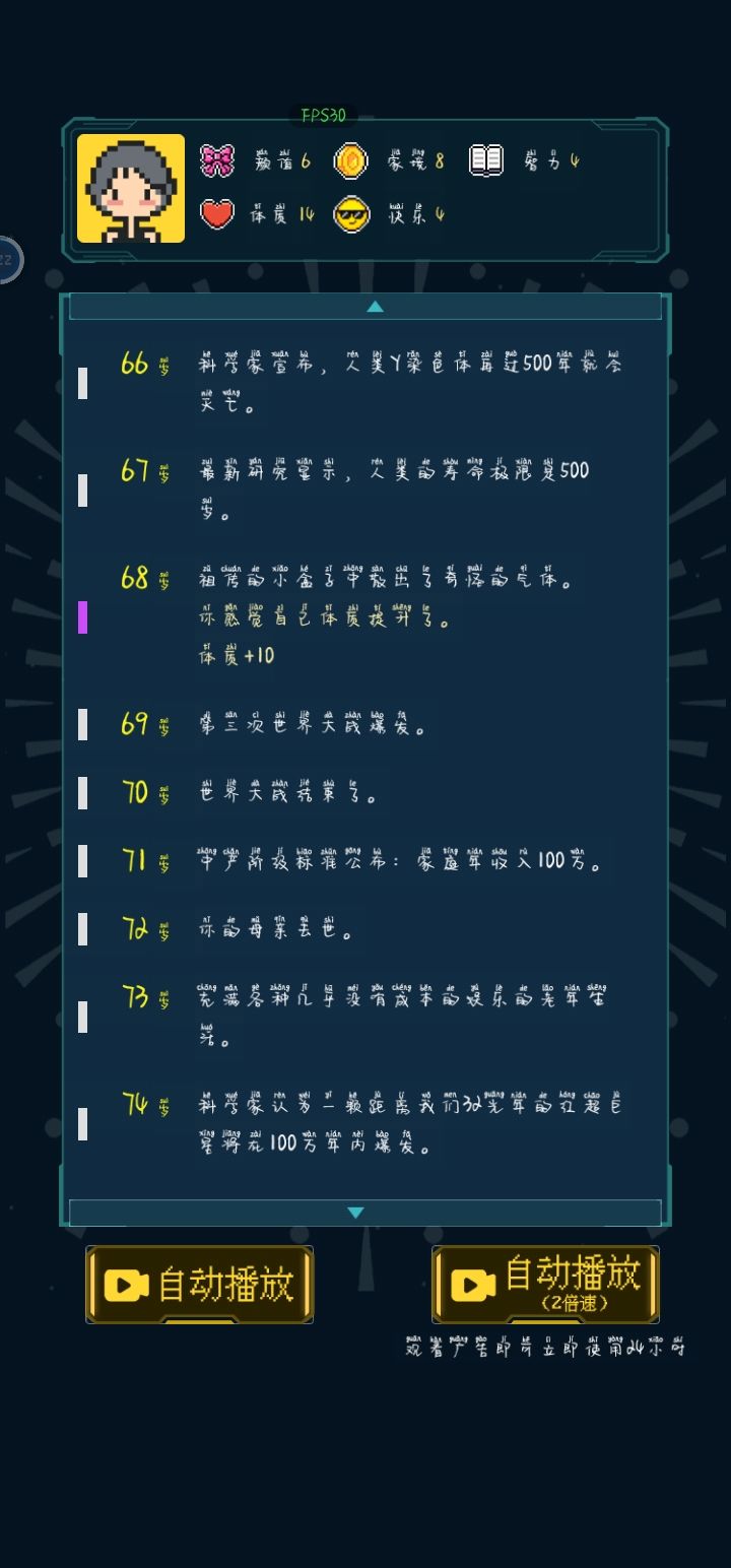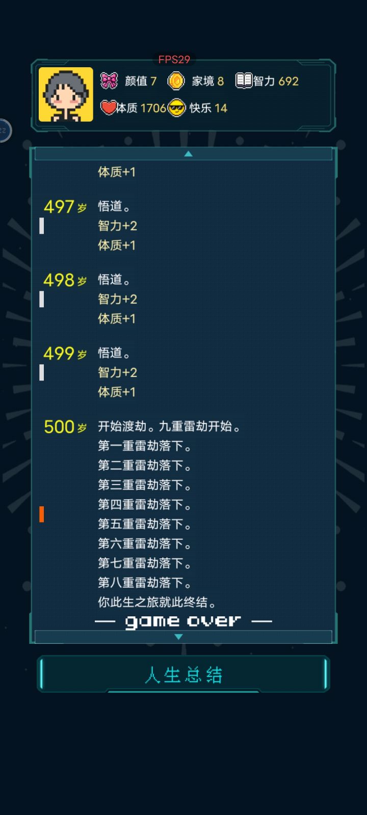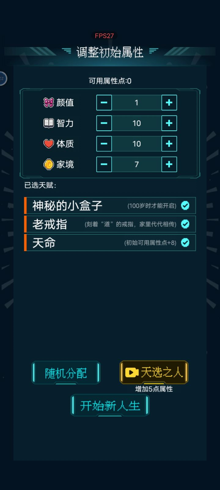 乞丐处买到书就稳了。我这买到书后面直接到大结局,不需要渡劫了。属性主智力体质,其他的也要点1-2,要不然容易早死。