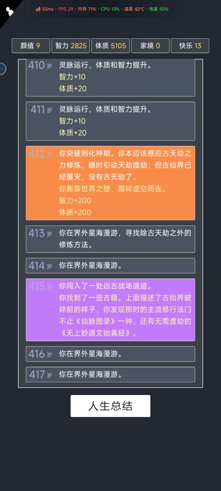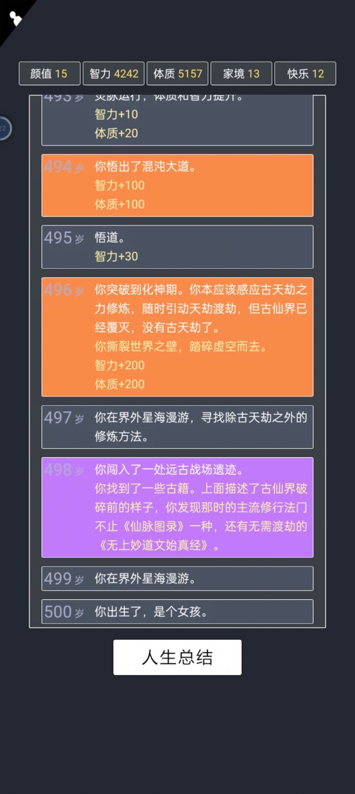 半神天赋yyds,完全不考虑家境和颜值。为啥没渡劫啊,真的没500岁之后的内容了嘛😂