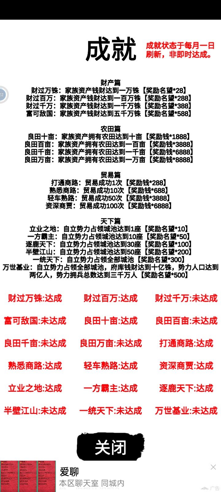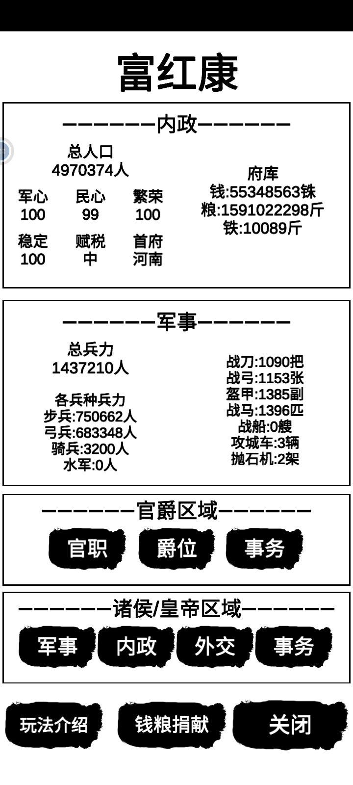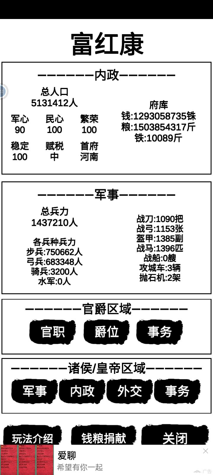 这次更新的第二版,可以说是非常简单,仅需三天的零散时间,就可以从官员到一方诸侯,只需要把开局给了钱和自己身上的钱,全部都拿去用于贸易,再把官员的工资,从往家族资产里加,改成直接加到自己上面,然后就可以开始一直在贸易,每次贸易成功都会给你几千或几百或几十,嗯,最好就是去东洋,搞三个商队,都去东洋,选十个商队成员,40个护卫,就可以纵横东洋,最后只需要慢慢肝钱就好,每个商队最多就拿50万,一次可以赚个八九万,这是在没有风暴和被打劫的情况下,最后把钱刚好做就买武力丹,体力丹和战功丹,功勋丹和名望丹,最后肝上大将军和王就行了,目前我只拿下了益州和荆州,还没统一,等后面统一了,再做详细的教程,还有每个月会减少10点的健康,前期经商的钱可以拿一部分来治病,等到后面升到了第二的官,就可以把父母饿死,减少粮食消耗,等粮食攒多点,你就可以拿去卖,然后买农田,农田前期是不赚钱的,要慢慢涨,到100亩左右就可以不用管它了,另外打城池的时候,最好选择那种比较有钱的,比如益州的蜀郡