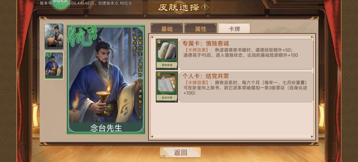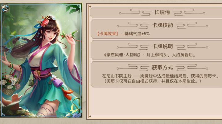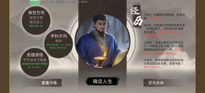 直接上干货想要开岁月卡,需要在地狱难度里,八个月成为举人,所以,第一张岁月卡至关重要。第一张岁月卡就选择岳麓书院,步骤是这样的(接下来要严格照着做)第一步,搞一个刘宗周,没有的换一个,超级便宜,只是个绿卡,我们需要他的专属卡,加抵御第二步,带卡的时候,随便带点能帮助论战的卡就行,然后带一个门客第三步,选经历这块,第一个问题选家财万贯,荫庇族人,第二个问题选商学,第三个问题选平平淡淡才