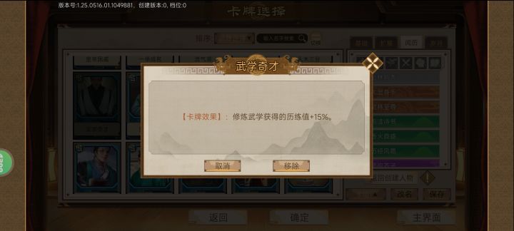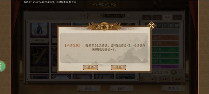 个人带的角色卡是王守仁金皮 天赋卡随便带的请教卡:徐渭-酒中豪才(画室),俞大猷-武林宗师(勇闯少林),严世藩-东楼鬼才(聚宝盆)画室不用说了,经济来源,也可以不带搞剧情妃子也不缺钱。带勇闯少林就是为了洗髓经,不想sl那个傻子才磕头剧情好气人的,个人觉得 打狗棍+洗髓经+随便轻功(目前最强的,一棍不死苟到再来一棍)严世藩作为门客,商学是满,的可以放到自宅的商铺,聚宝盆使用后直接给1w两。京