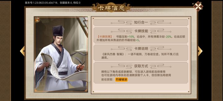 推荐卡牌攻略——绝品令与转盘卡绝品令:巧言利口:【换到即书生毕业,很多流派都要靠这玩意,真滴爽】明王现世:【随着版本的更新其含金量越来越大,如樊哙个人卡持盾却敌以及凝袭剑法的大衍化盾“理论上”都是依赖于防御力这一数值的】(吐槽一下,我看预告说化盾对于防御有依赖的,结果整一个每回合200点高额护盾。)深思熟虑:【感觉鸡肋,武侠开局或者三线都是直接使用蹇义的天府宅邸,但类似于这种藏品地