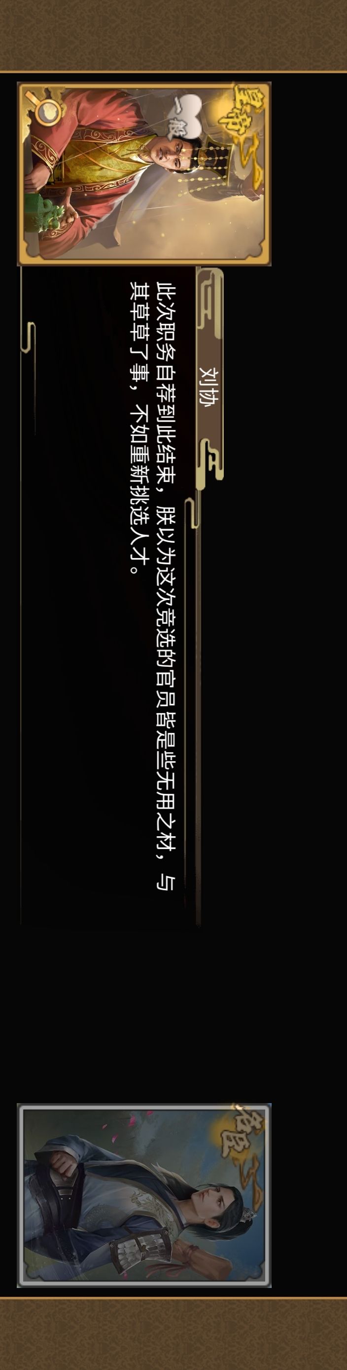 这是什么意思?前面还说成功,后面给我来这一句,在举荐的时候皇帝还夸,赢了就说全都不行,有毒吧?我举荐的人属性都很高了都是八九十属性,一进去评分也有9