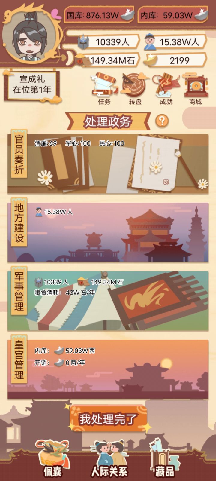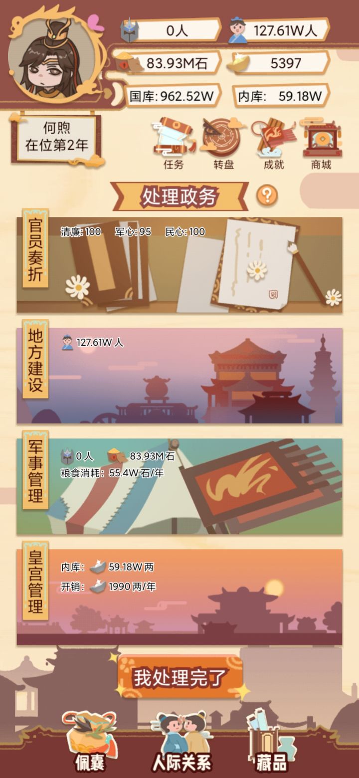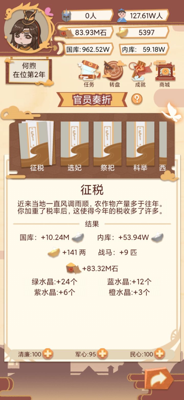 然后后面粮食多了就可以偶尔放粮一次可以+20民心,放了粮就不要科举和赈灾,可以省好多钱!!