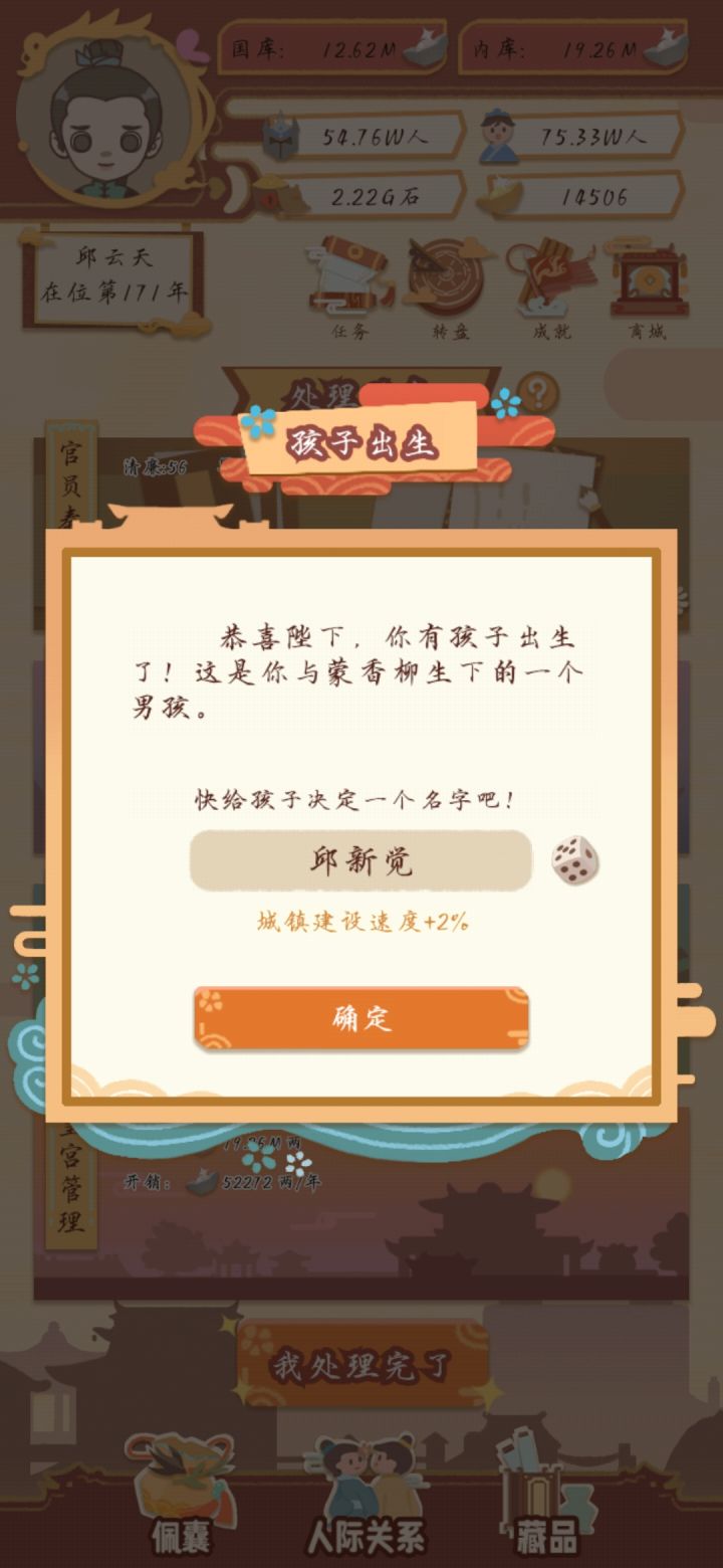5.剩下就可以一直刷钱刷钱,然后生一个孩子为后面禅让做准备(孩子记得好感要刷看他喜欢什么!!如果是每年自己加好感的最好!!)因为禅让要好感满了来。
