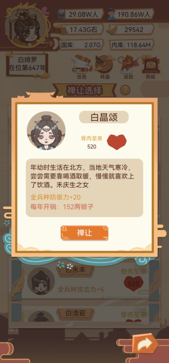 要是后代的属性可以叠加就好了,比如防御+20,商业建设速度+6%,为人类的进化而肝起来😂不得不说,老母亲给她留的男人女人她愣是全都铲除了,不愧最是无情帝王家。