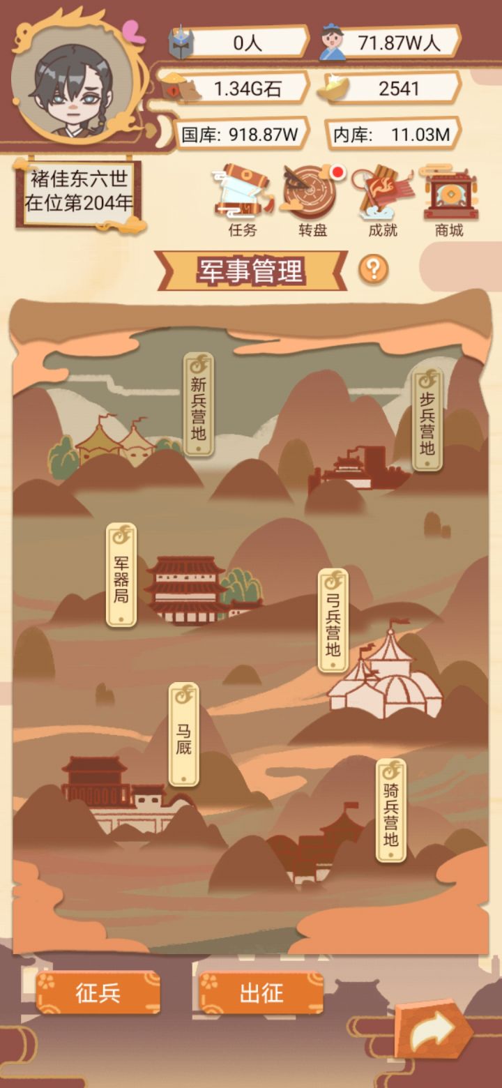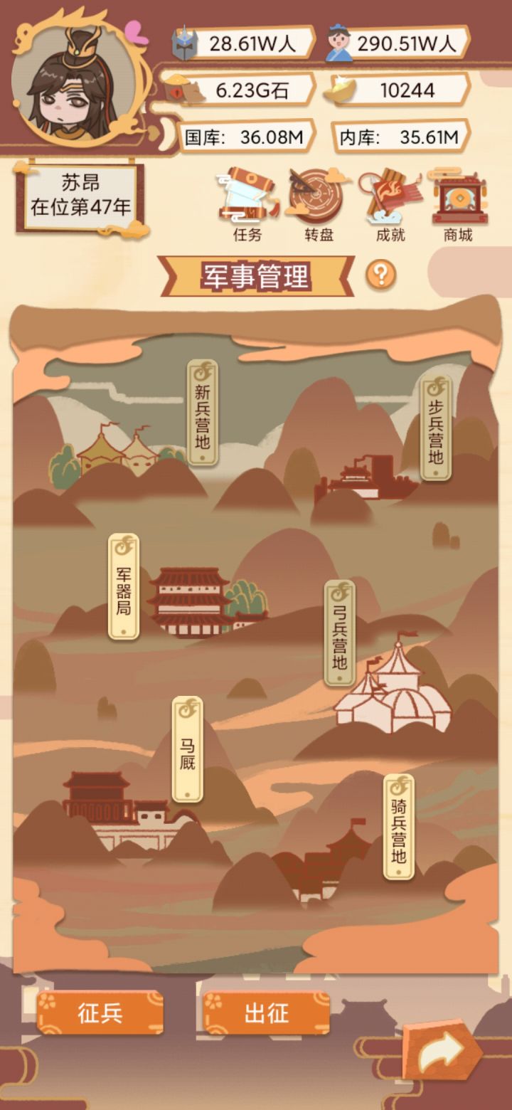 军事管理bug1.可招兵的营地达到100级后无法招兵2.包括军器局在内的所有军事设施能突破100级上限但不会增加数值