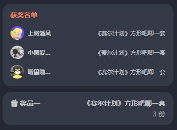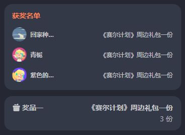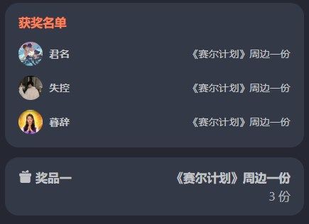 <公布本期活动的获奖名单>《赛尔计划》龙缘万象春节版本PV上线活动开奖啦!感谢大家的热情参与!!让我们恭喜以下获奖的顾问们!(鼓掌!~(‾⌣‾~)【领取方式】请以上玩家及时在开奖页面填写邮寄地址~我们会尽快核实并发出奖品~领奖截止日期为:2024年2月28日18:00前逾期未领取视为放弃本次活动奖励,请各位玩家及时联系官方领取~没有获奖的顾问们不要灰心!后续还有更多活动内容发布,请多
