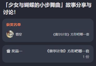<公布本期活动的获奖名单>《赛尔计划》「少女与蝴蝶的小步舞曲」故事分享讨论活动开奖啦!感谢大家的热情参与!!让我们恭喜以下获奖的顾问们!(鼓掌!~(‾⌣‾~)【领取方式】请以上玩家及时在开奖页面填写邮寄地址~我们会尽快核实并发出奖品~领奖截止日期为:2024年2月27日18:00前逾期未领取视为放弃本次活动奖励,请各位玩家及时联系官方领取~没有获奖的顾问们不要灰心!后续还有更多活动内